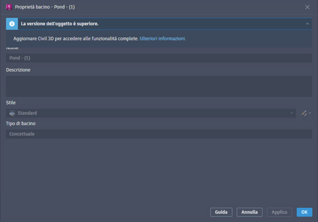 viene mostrato un avvertimento. È necessario installare una versione più recente di Civil 3D per modificare gli oggetti.