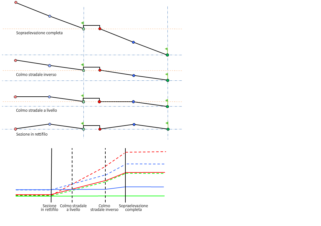 Nell'illustrazione che segue viene mostrato il metodo di rotazione All'interno della curva per una sezione stradale a doppia falda e doppia carreggiata.