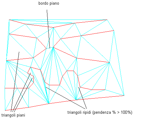 Nell'illustrazione che segue viene mostrata una superficie con aree piane in cui i triangoli (in ciano) di una superficie sono stati creati da linee di curve di livello rosse. Di seguito sono indicati alcuni dei triangoli e dei lati piani: