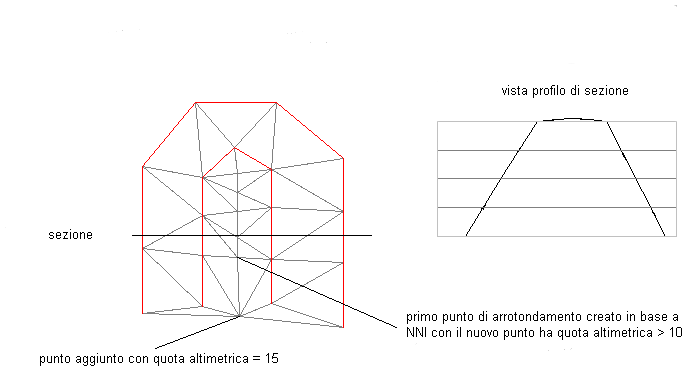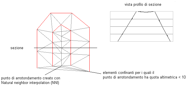 Tali risultati si ottengono in quanto l'interpolazione NNI utilizza i punti circostanti per stabilire una quota altimetrica appropriata per un nuovo punto. Tutte le quote altimetriche circostanti sono inferiori rispetto al triangolo piano. Tali quote vengono selezionate per i punti aggiunti, pertanto si determina lo sprofondamento dello spigolo.