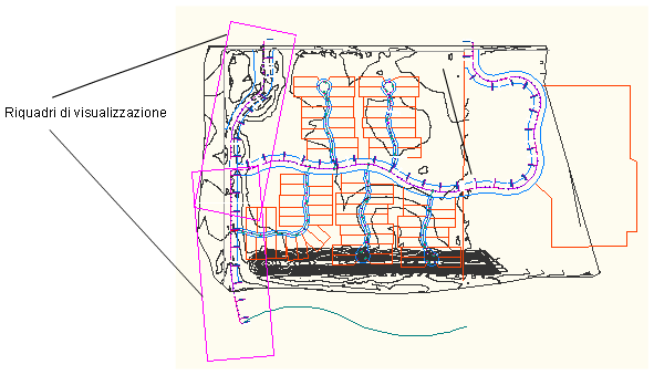 La procedura guidata Crea riquadri di visualizzazione e Crea fogli consente di creare fogli in cui sono visualizzati automaticamente segmenti di tracciati e profili nelle planimetrie. È possibile creare gruppi di riquadri di visualizzazione che acquisiscono automaticamente aree predefinite lungo un tracciato.