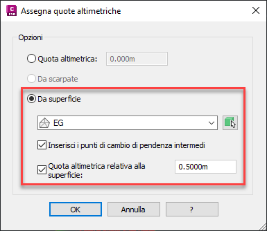 Durante la creazione di una linea caratteristica, è possibile immettere manualmente una quota altimetrica o assegnare quote altimetriche da una superficie o da scarpate.