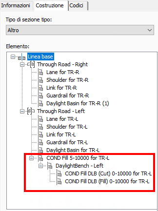| Pendenza % layout | 4.000:1 | Specifica la pendenza % della linea disegnata per rappresentare questo componente sezione tipo in modalità layout. Questo parametro, insieme al parametro Larghezza layout, consente di posizionare il componente sezione tipo Sterro o riporto condizionale e i componenti sezione tipo ad esso associati. Non viene tuttavia visualizzato né influisce sul tipo modellatore. |