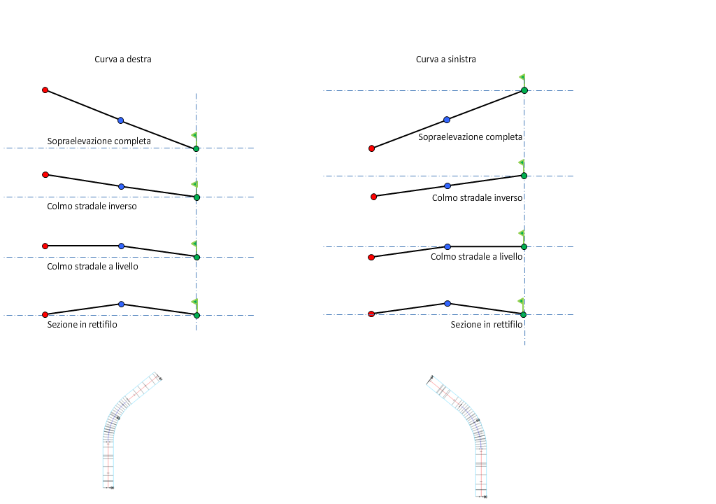 Nell'illustrazione che segue è rappresentato il metodo di rotazione Lato destro per una sezione stradale a doppia falda e unica carreggiata.