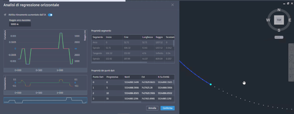 - In Civil 3D ora è disponibile un'opzione di rilevamento basata su Machine Learning per l'Analisi di regressione orizzontale, oltre al metodo di rilevamento classico esistente. Questa funzionalità basata sull'intelligenza artificiale offre un'alternativa quando gli algoritmi tradizionali sono meno efficaci.