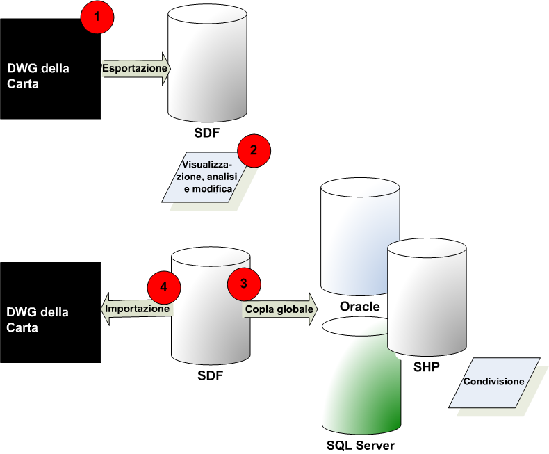 | Esportare la Mappa o singoli layer di Carte in formato Autodesk SDF o in formato SHP o Oracle, quindi utilizzare Copia globale per esportarla in altri formati. | I dati DWG originali rimangono invariati. |