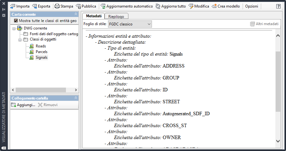 Se una Carta contiene oggetti classificati, i relativi metadati vengono generati e visualizzati automaticamente alla prima apertura del Visualizzatore di metadati.