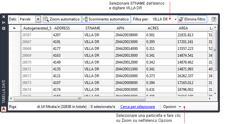 È possibile visualizzare la tabella dati per qualsiasi layer. Filtrare la tabella dati per visualizzare un sottogruppo di particelle; in questo caso, solo le particelle incluse in Villa Drive.