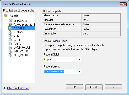Con il comando Dividi è possibile impostare regole per l'assegnazione delle proprietà quando si dividono e si uniscono entità geospaziali. Per definire tali regole, è possibile utilizzare le espressioni.