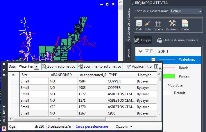 Nella Tabella dati vengono visualizzate le proprietà generali e i dati oggetto specifici del layer Waterlines.