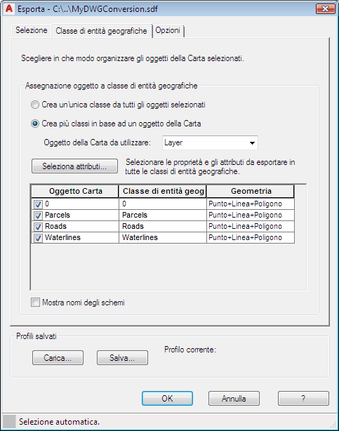 La tabella nella finestra di dialogo viene aggiornata per mostrare i nomi da utilizzare per i layer e le classi di entità geografiche.