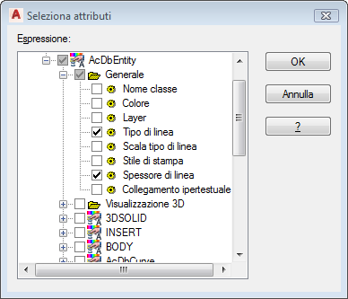 Gli attributi qui specificati vengono assegnati ad ogni classe di entità geografiche nel file SDF ed è pertanto necessario selezionare solo quelli appropriati a tutte le classi. È ad esempio possibile selezionare proprietà generali, che includono ad esempio lo Spessore di linea, ma non proprietà dei dati oggetto che sono specifiche di ogni classe di entità geografiche.
