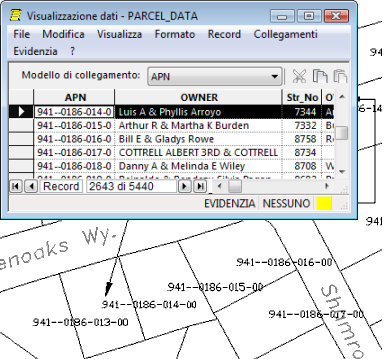 Utilizzare la Tabella dati per evidenziare i dati di specifiche entità geografiche della Carta. Set di strumenti AutoCAD Map 3D gestisce il collegamento tra i dati spaziali e i dati degli attributi. Se si aggiornano i dati degli attributi, gli aggiornamenti vengono automaticamente applicati alla Carta.