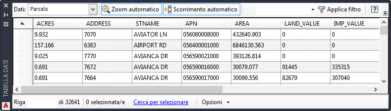 Aggiungere ora un layer che visualizzi le particelle in una parte della città di Redding. Questo layer contiene le informazioni su dimensioni, valore e indirizzi delle particelle. Non contiene informazioni sui proprietari. Successivamente verrà eseguito il join ad una fonte dati contenente tali informazioni.