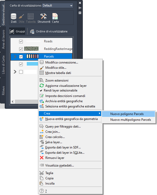 Ciascun elemento nel Set di strumenti AutoCAD Map 3D dispone di un menu personalizzato contenente i comandi disponibili al momento per l'elemento.