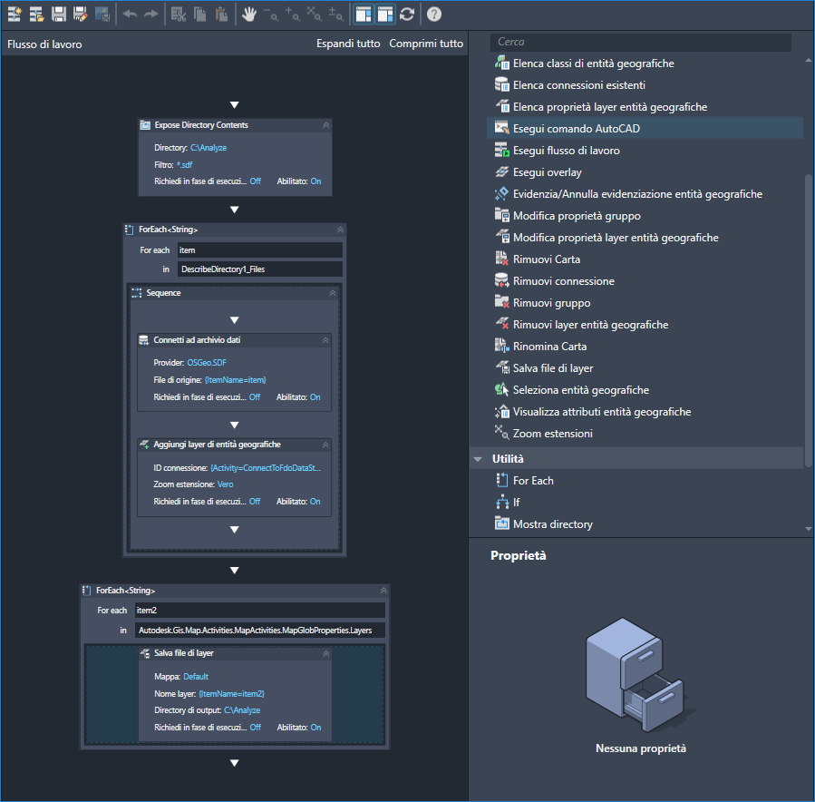 LoopAddLayers è un'attività ForEach, che ripete una determinata azione su una raccolta specificata di elementi. Questo tipo di attività è disponibile nel riquadro degli strumenti Utilità.