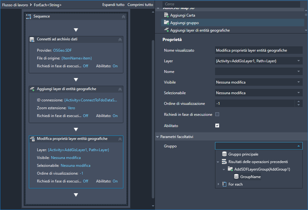 Poiché si desidera modificare la proprietà Gruppo per ciascun layer aggiunto, posizionare questa attività all'interno dell'attività ForEach denominata "LoopAddLayers".