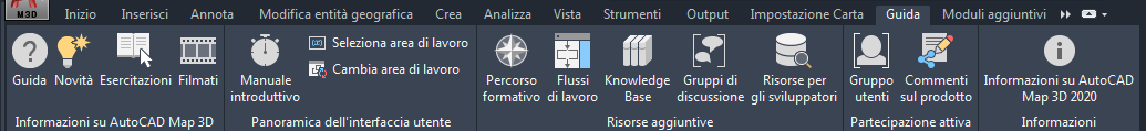 - Guida in linea: consente la ricerca e la consultazione di concetti e procedure relativi a tutti gli aspetti di Set di strumenti AutoCAD Map 3D.