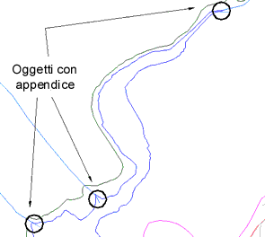 Le appendici sono spesso dovute ad una digitalizzazione imprecisa, quando un oggetto si estende oltre l'intersezione con l'oggetto di destinazione. Utilizzare Dividi intersezioni prima di Cancella oggetti con appendice.