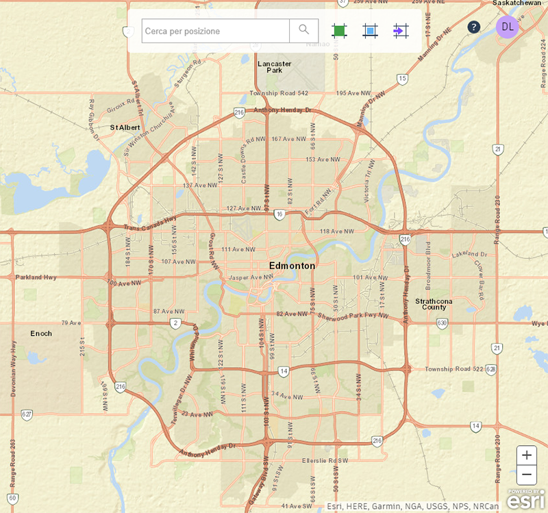 Immettere un nome di posizione, indirizzo o punto di interesse nella barra di ricerca. È inoltre possibile immettere coordinate di latitudine e longitudine, oppure importare un file SHP che definisce l'area di interesse. Utilizzare il mouse per eseguire la panoramica e lo zoom o utilizzare gli strumenti zoom (pulsanti +/-) per perfezionare ulteriormente la ricerca. Utilizzare gli strumenti di selezione per definire l'area di interesse.