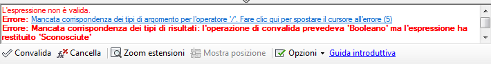 Quando si salva un'espressione, ne viene sempre verificata la validità. Tale verifica può anche essere eseguita prima del salvataggio.