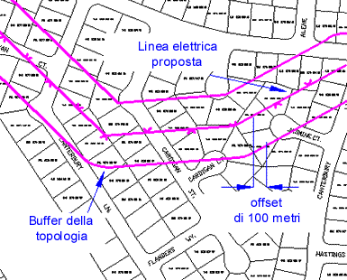 Utilizzare l'analisi del buffer per visualizzare un'area intorno ad una topologia esistente. In tal caso, l'analisi del buffer della topologia rete della linea elettrica crea una nuova topologia poligono.