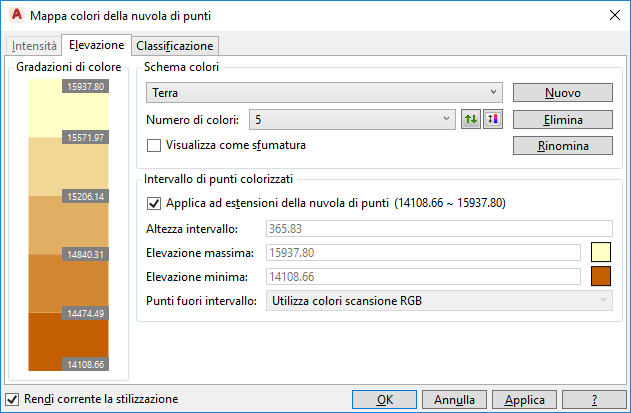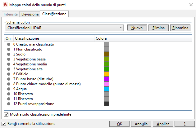 Nota: Per Intensità, Quota altimetrica e Classificazione, la stilizzazione si basa sugli schemi di colori assegnati nella finestra di dialogo