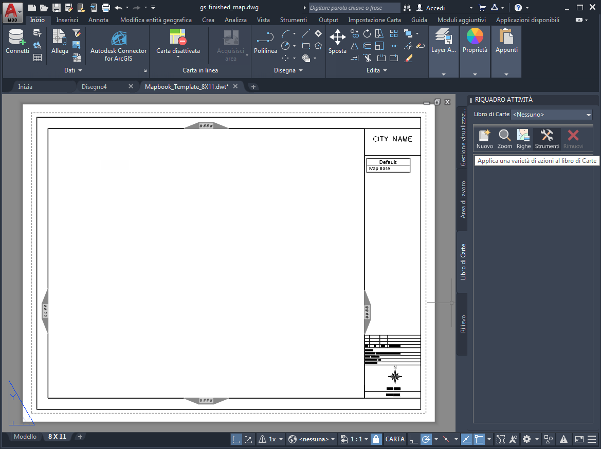Dopo aver definito il modello del libro di Carte e aver salvato la Carta, è possibile pubblicare il libro di Carte su un plotter oppure in un file DWF.