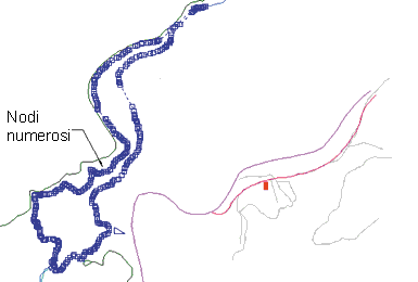 Quando si utilizza Semplifica oggetti, le polilinee complesse vengono semplificate rimuovendo tutti i nodi interni compresi nella larghezza di tolleranza specificata. I segmenti di polilinea che rientrano nello stessa tolleranza di approssimazione vengono generalizzati in una singola polilinea. I punti di ramificazione, i vicoli ciechi e i punti finali delle polilinee non vengono generalizzati.