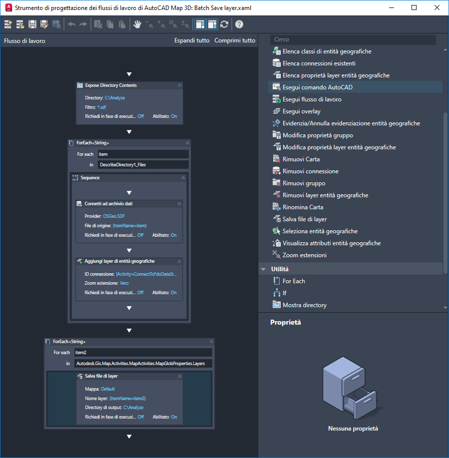 - Salvataggio in batch dei file .Layer: connettersi a ciascun file SDF in una directory specificata e aggiungerlo al Set di strumenti AutoCAD Map 3D. Salvare ciascun layer di Gestione visualizzazioni risultante come file .layer.
