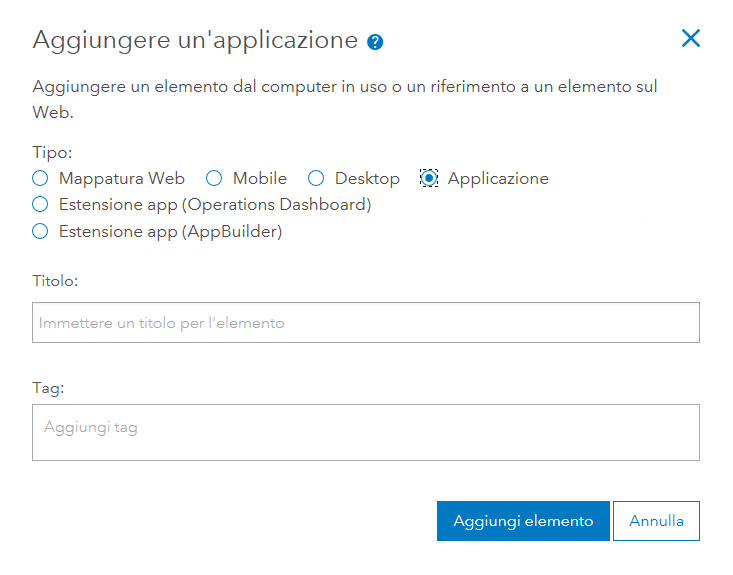 - Nella finestra di dialogo Aggiungi una applicazione, selezionare Applicazione e immettere il titolo e i tag appropriati, quindi fare clic su Aggiungi elemento.