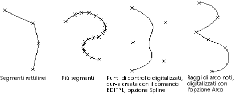 - Tuttavia, per quanto si lavori con precisione, durante la digitalizzazione delle curve alcuni dati andranno inevitabilmente persi. È necessario digitalizzare un numero maggiore di punti durante la creazione di curve accentuate per garantire una maggiore accuratezza della linea. In ogni caso, mentre si riduce la perdita dei dati, si aumenta la dimensione e la complessità del file. Se si conoscono i parametri utilizzati per la definizione di una curva regolare, ad esempio il raggio o la lunghezza, utilizzare per la digitalizzazione l'opzione Arco dei comandi PLINEA e MAPDIGITIZE. Le linee irregolari, ad esempio i profili topografici, andrebbero rappresentate con polilinee continue e possono essere rese uniformi con l'opzione Adatta di EDITPL, se necessario. Impostare la variabile di sistema PLINEGEN su 1 (on) prima della digitalizzazione, in modo da consentire la valutazione corretta dei tipi di linea tratteggiata.