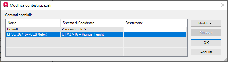 - Fare clic su Modifica Sistemi di Coordinate, quindi, nella finestra di dialogo Modifica contesti spaziali, fare clic sulla voce appropriata.