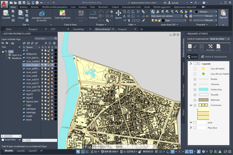 Questa Carta contiene sia i layer di AutoCAD (a sinistra) sia i layer di Gestione visualizzazioni (a destra).