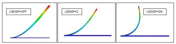 Shown below are the results of the three runs. The first image shows the unrealistic "growth" that occurs when large displacement effects are turned off (LGDISP=OFF). The second image shows the results of large displacements turned on, but follower forces turned off (LGDISP=2). The final image uses large displacement effects with follower forces and is the most accurate (LGDISP=ON).