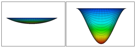 The images below show two results of the pre-stiffened drum membrane. The first image is an actual deflection with large displacement effects turned on (peak deflection is 0.8 inches). The second image is the deformed shape with large displacements turned off. Note in the second image the deformation is scaled down, as the peak deflection is over 5,000 inches.