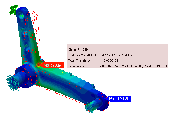 To view the exact value of a quantity on the model, click Probes from the Results panel of the ribbon. While the Probe tool is active, an information box displays the active scalar value where the cursor contacts the model: