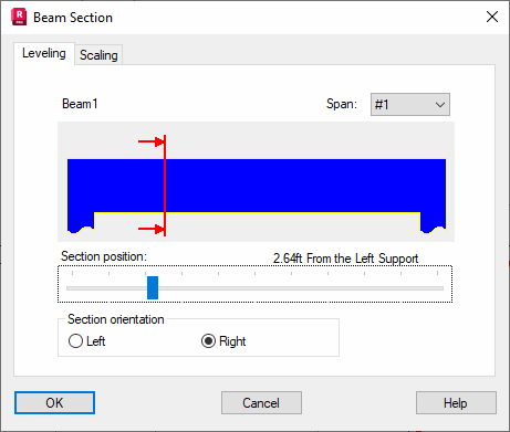 On the Levelling tab in the Beam Section dialog, you can select the cross section and the Span of a beam displayed on the working drawing.