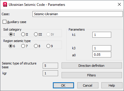 Parameters of a structure seismic analysis depend on a seismic code used during calculations of a structure influenced by seismic impact. Select Ukrainian seismic code in the New Case Definition dialog or click Parameters in the Analysis Type dialog.