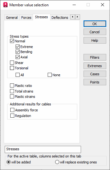 Select the Stresses tab in the Bar Value Selection dialog to define stress values for presentation.