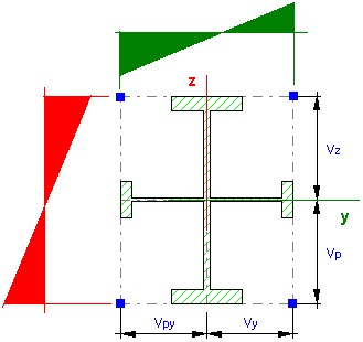 then stresses are calculated at characteristic points of the section, located in corners of the contour defined by the distances Vy, Vz. It may lead to overrated values of stresses at a point outside the section (blue points in the drawing).