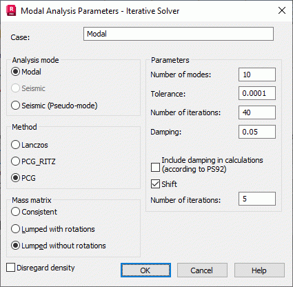 Mass matrix type (lumped with rotations or consistent) and number of modes. Precision of calculations depends on Number of Modes.