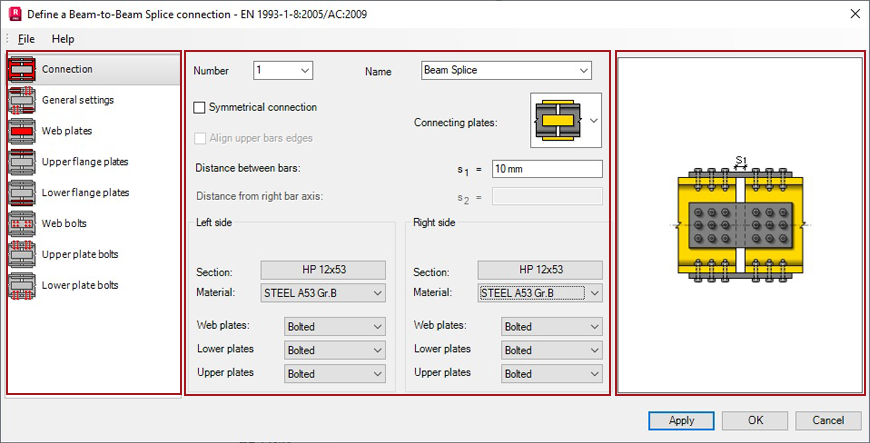 - The Web bolts and Flange plates bolts sections allow you to specify the bolts parameters for the connection.