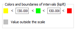 The Colors and boundaries of intervals field determines colors for three intervals of variability of a selected quantity. A unit automatically adjusts to the quantity selected on the NTM/Stresses tab (forces or stresses). Clicking a color icon opens another dialog, where you can select a color for a given interval. The Division edit field is not accessible (by standard a number of divisions equals 3).