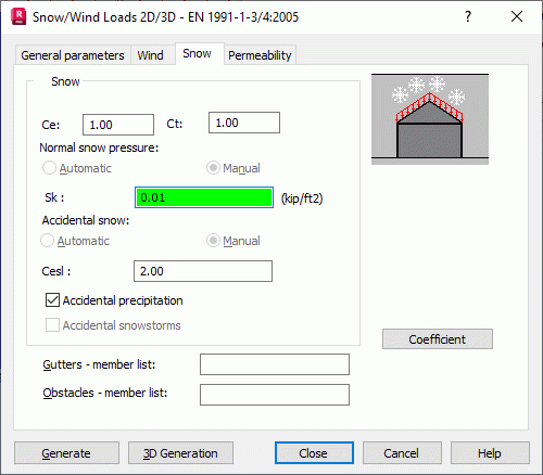 For the general snow/wind code, Eurocode1 and for the British version,you cannot automatically generate normal and extreme snow pressure, because a snow region is not specified. Therefore, the required pressure must be entered manually.