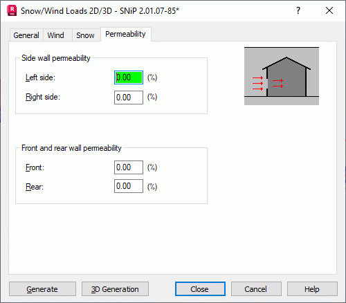 Opening the Snow/Wind Load dialog and clicking the Permeability tab displays the following dialog.