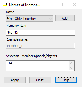 At the bottom of the dialog, is the Selection - members/panels/objects field. This field is used to specify numbers of members, objects, or panels which should be assigned the name specified by the name syntax.