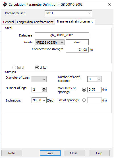 The Transversal reinforcement tab of the Calculation Parameter Definition dialog box for the Chinese code GB 50010-2002: