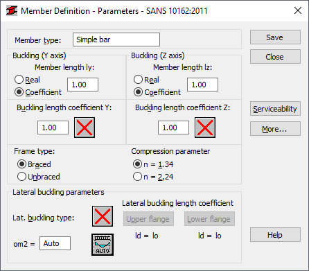 The Buckling Length Coefficient option defines member buckling length coefficients in both directions. The actual bar length (or the sum of the component member lengths) is automatically entered in the appropriate fields.