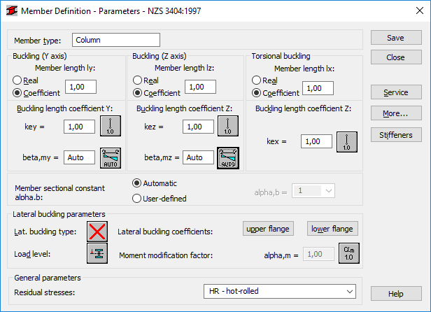 Use the Member Definition - Parameters dialog to define parameters of the member type for the New Zealand steel code NZS 3404:1997. Open the dialog using either of the following ways: click the New steel member definition icon in the Member Type dialog, or click the Parameters button in the Definitions dialog.